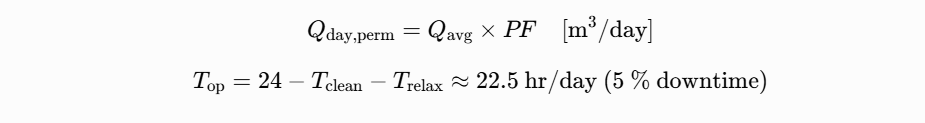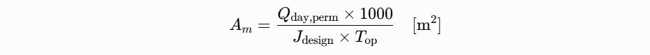 | Design Flux (Net) | $J_{\text{design}}$ | LMH | 15–22 (municipal) 8–18 (industrial) | Lower $J$ = lower fouling |