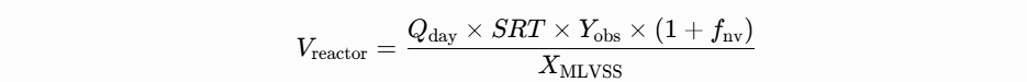 Typical inputs: $Y_{\text{obs}}$ = 0.12 kg VSS/kg BOD, $f_{\text{nv}}$ = 0.4, $X_{\text{MLVSS}}$ = 0.75 × MLSS.